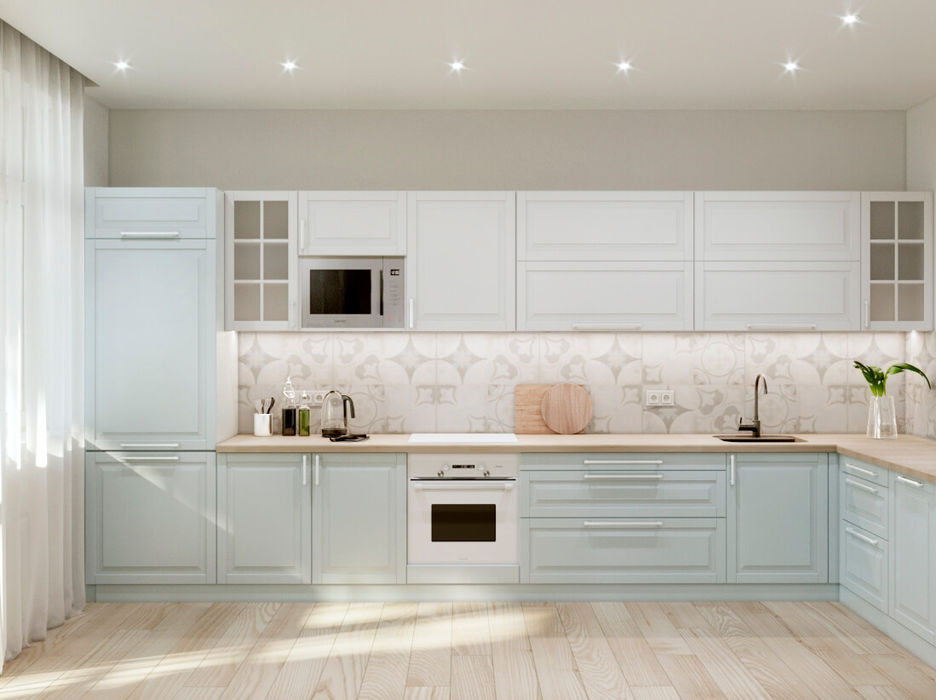 Ми розробили дуже багато варіацій кольорових поєднань для кухні, але зупинились саме на цьому, м'який м'ятний колір в поєднанні з чистим білим відтінком. Кухня вийшла досить функціональною, в ній були враховані всі побажання клієнта щодо корисного використання площі, кожен сантиметр був задіяний для оптимізації зберігання.