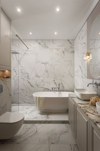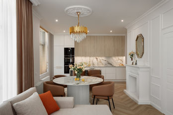Загалом, квартира виконана в дуже світлих відтінках з додаванням молдингів на стінах, що підтримує класичний стиль, а додавання золотих акцентів робить інтер'єр більш вишуканим та сучасним.