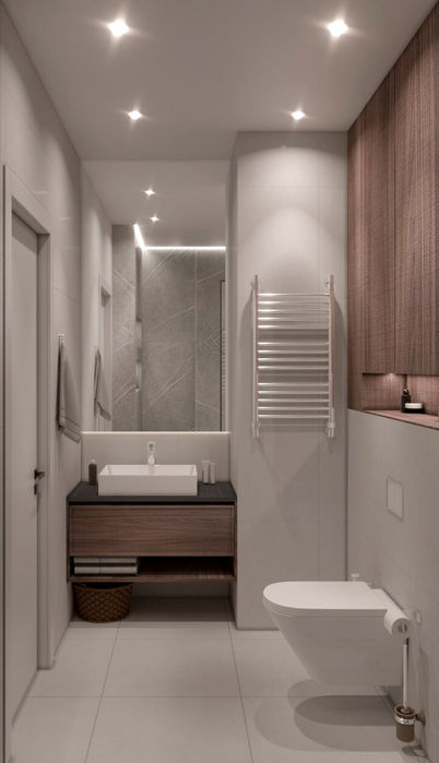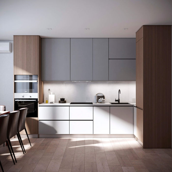 Комбінація кольорів в цій квартирі створює атмосферу елегантності та стилю, додаючи приміщенню витонченості та характеру. Натуральні відтінки дерева доповнюють темні тони, надаючи приміщенню тепла та природності, що робить його привабливим та затишним.