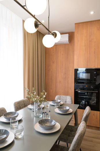 Кухня-вітальня вражає своєю просторістю та функціональністю, з великим обіднім столом та просторою кухнею, обладнаною усіма необхідними приладами та аксесуарами для приготування їжі.