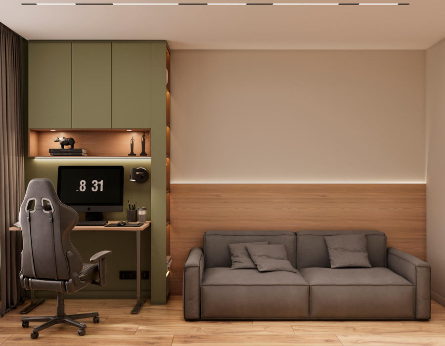 В квартирі переважають зелені акценти, що надають приміщенням спокій та затишок, світлі пастельні відтінки гарно підкреслюють акцентний зелений колір, також в інтер'єрі використовується натуральний відтінок дерева.
