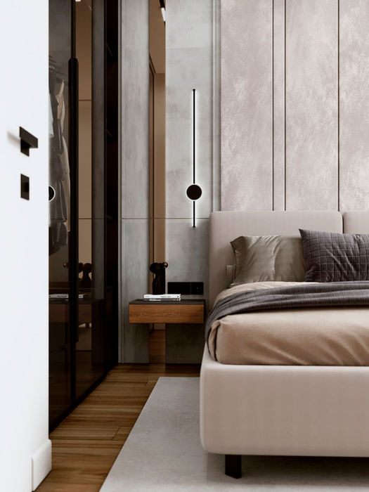 Батьківська спальня - окраса даної квартири. Розмаїття оздоблювальних елементів створюють атмосферу стильного і в той же час гармонійного простору для сну. М'які панелі за ліжком круто поєднуються зі дзеркальними вставками та штукатуркою на фоні. А при різному освітленні: бра/основне світло/підсвітки, замовники можуть створити різний настрій у кімнаті.