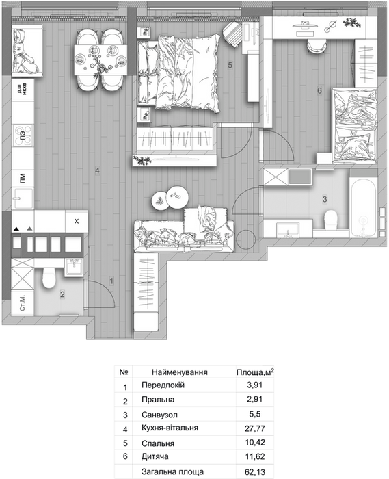 Площа проєкту: 62,13 м²
